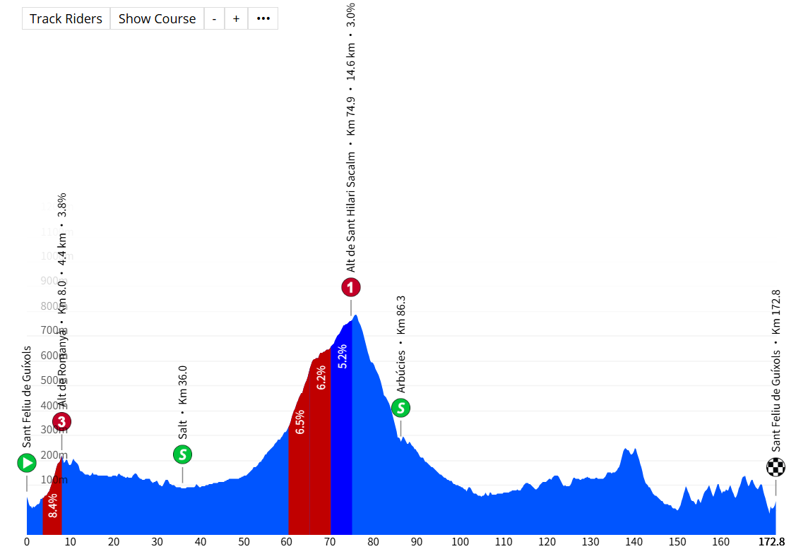 首个赛段的路线每年都会有所不同,但其本质始终如一。车手们在克服沿途的数个爬坡后,最终抵达圣费利乌德吉索尔斯,迎接一场极具挑战性的终点冲刺。在一段充满弯道和起伏的技术路段之后,最后500米的坡度将达到约5%。