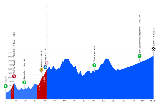 第四赛段缩短为151公里,爬升2841米。赛段原定在瓦尔特滑雪场的加泰罗尼亚环绕台顶结束,海拔2110米,但由于计划终点爬坡时阵风强劲,终点被移至海拔988米的坎普罗东。