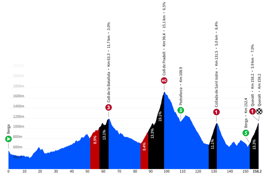两年前,加泰罗尼亚自行车赛也曾设过一个从贝尔加到克拉尔特的赛段。事实证明,那是该届赛事中最具挑战性的山地赛段。塔德伊·波加查在最后30公里发起进攻,单飞夺冠,赢得了他当年四个赛段冠军中的第三个。当时的路线与今年的路线非常相似,但并非完全相同。