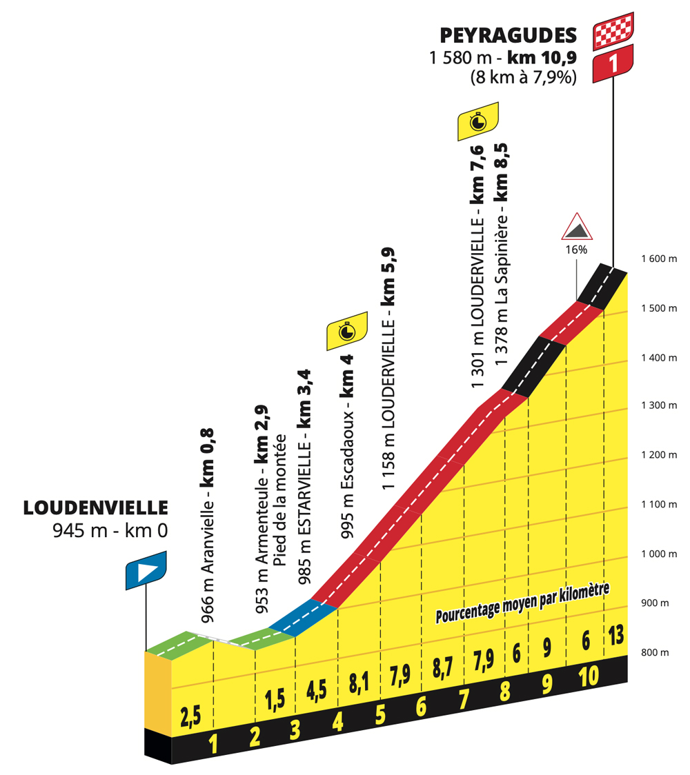 计时赛将车手从Loudenvielle的山谷带到payragudes顶上的机场跑道。经过 (非常) 短暂而平坦的加速后,在接下来的计时赛中,它主要攀升至近1600米的海拔高度。Pe-ragudes (7.8% 处8公里) 及其困难: 随着攀登的进行,攀登变得越来越陡峭。最后一公里的坡度百分比几乎不会降至10% 以下,16% 的最陡部分位于计时赛的最后一公里。一路上,中间点位于3.5公里和8.5公里之处。