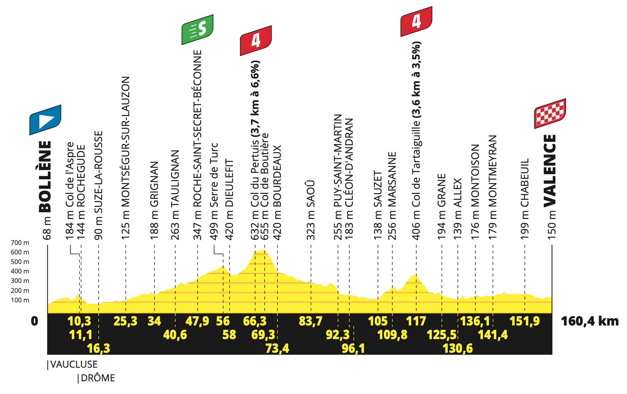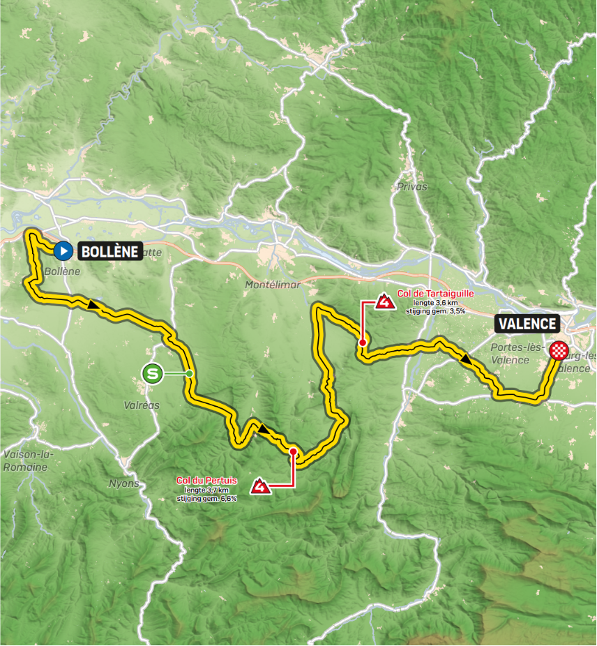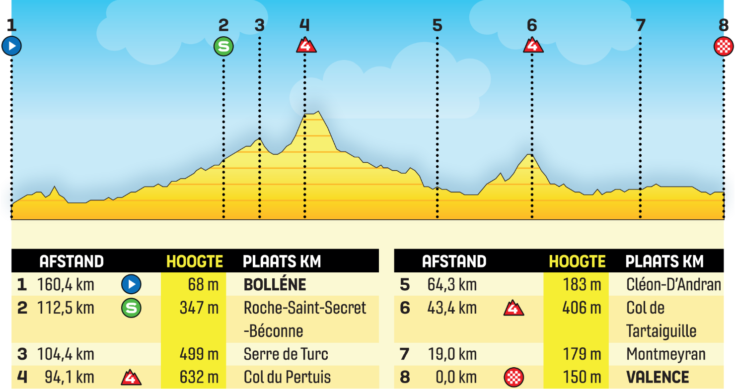 舞台也不是很长,162公里。因此,许多骑手会感觉到他们的机会。在即将到来的两个艰难的高山舞台上,周三的peloton可能会轻松一些。因此,为Mathieu van der Poel和Wout van Aert的骑手提供了机会。然而,在最后八公里,你总是在眼前。这些经过一条直路到达瓦朗斯,直到最后一公里的最后一个发夹弯。可以等待最长时间 (冲刺) 的逃犯可能会赢。