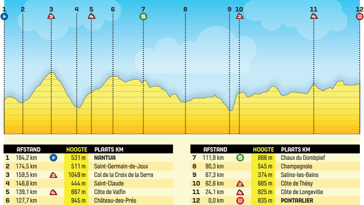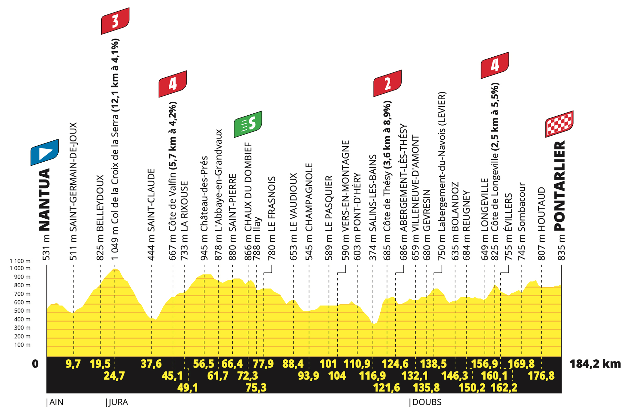在汝拉,设计了一个带有一个col和四个山丘的舞台。在前25公里的艰难起步中,巡回赛中最好的逃脱者可以再一次脱颖而出。如果他们离开了Col de la Croix de la Serra,他们可以在过去的70公里内有所作为。这始于极其陡峭的c ô tede Thiesy (3.7公里,略低于9% 平均坡度)。那里的人把自己和懦夫区分开来。在决赛中,还有两个山丘,您可以将比赛扔到一边。节约能源是建议; 蓬塔利尔的最后几百米令人不快地上升,尤其是在巡回赛三周之后。