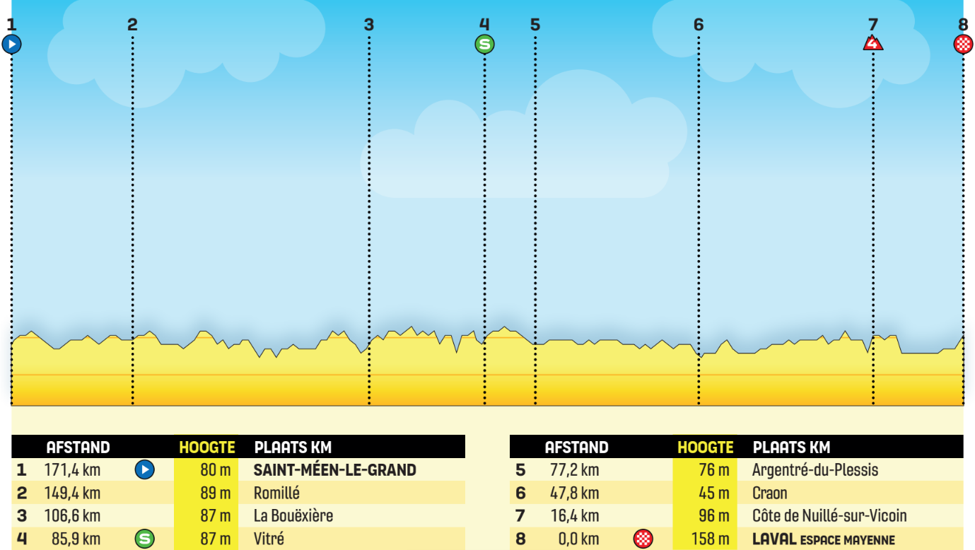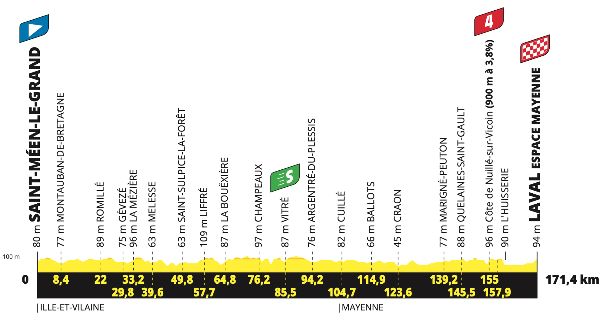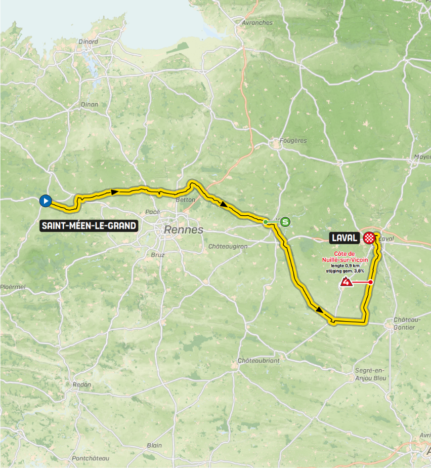 像这样的讲台可能不在星期六。整个舞台几乎是平坦的,舞台的最后三公里沿着Mayenne河一直延伸到终点。在过去的1.7公里中,仍然需要克服海拔35米,但在任何地方都不会变得非常陡峭。但是仍然: 经过整整一周的比赛,平均3% 的小坡度可能足以满足冲刺车手的需求。