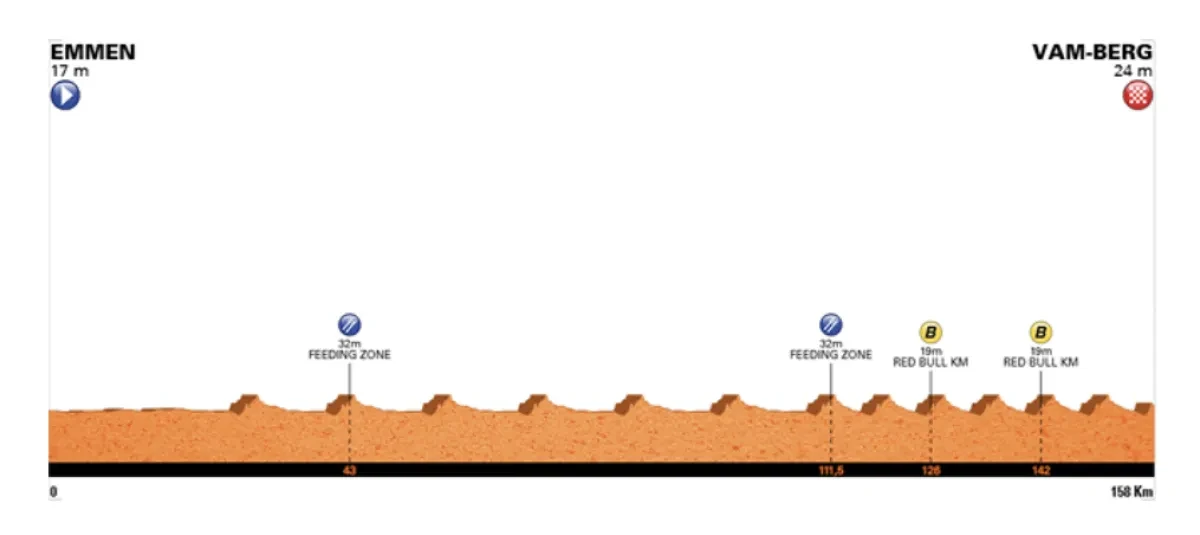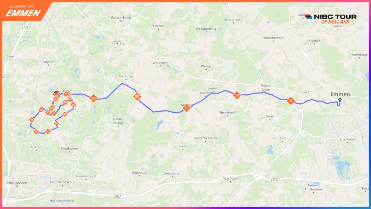 荷兰之旅的第四阶段也是一个丘陵。车手从Emmen到vam-berg行驶了157多公里,尽管他们将在一天中的大部分时间里在周围的环境中比赛。 在那里,等待着不少于11次的攀登,其中包括两个也具有 “德伦特屋顶” 的大型赛道。在最后的40公里中,骑手将在vam-berg周围短短的五圈,每圈八公里。 在vam-berg的最后一次攀登之后,快速进入终点等待着,包括下坡。掉落在那里的车手仍然有机会重新获得联系并在正确的小组中完成比赛。
