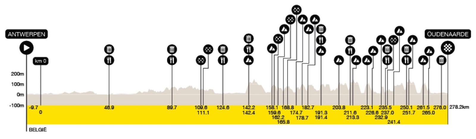 最后55公里的赛程相比近几届略微轻松一些。由于Steenbeekdries和Stationsberg两段路程被移除,这一段少了一个鹅卵石爬坡和一个鹅卵石路段,这或许能让体力不支的车手在Taaienberg、Oude Kruisberg/Hotond、Oude Kwaremont和Paterberg的决胜冲刺前获得足够的恢复时间。