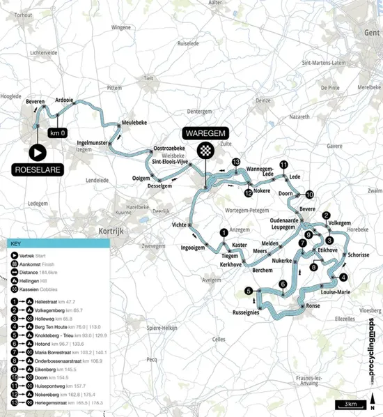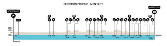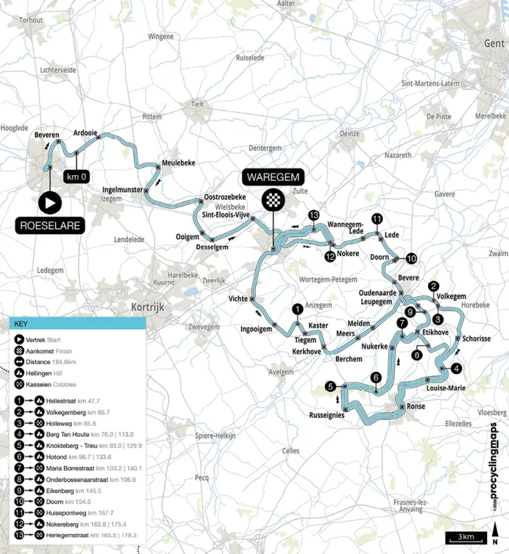 全长184.6公里,包含7段鹅卵石路和12个爬坡路段。大部分赛段集中在自行车运动中心奥德纳尔德以南的85公里路段。