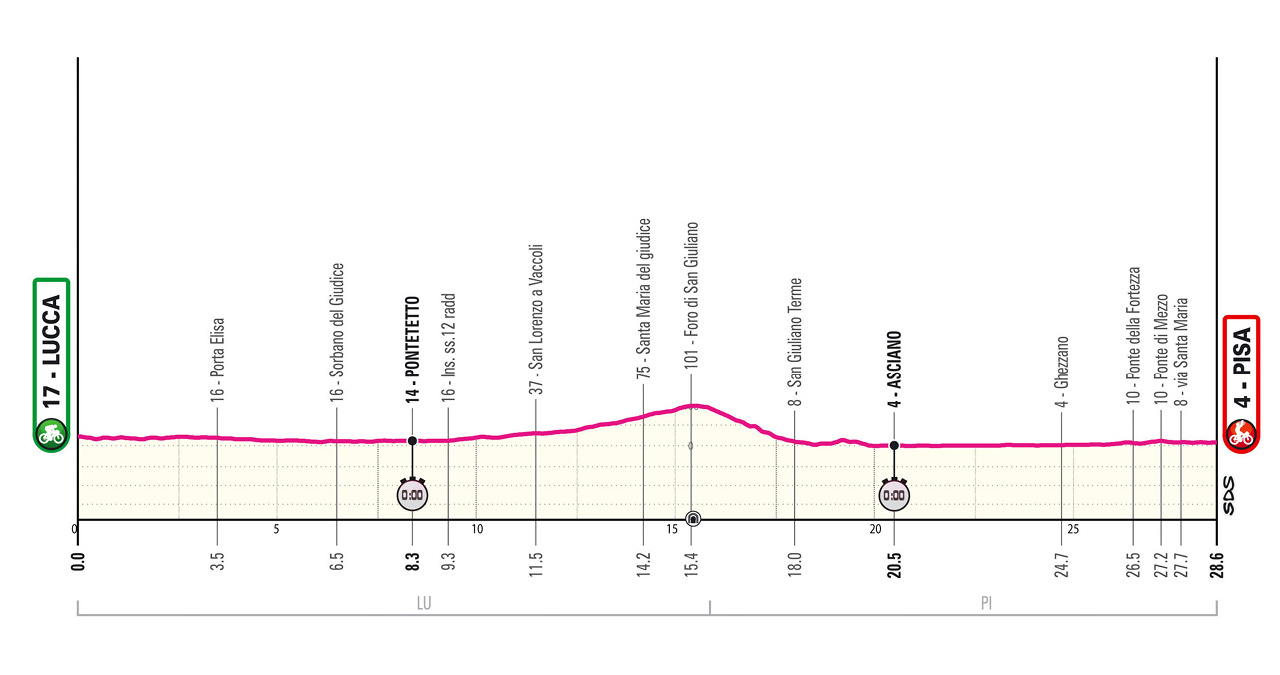 在第二个休息日之后的第二天,骑手可以再次将他们的计时赛自行车带出马stable,因为现在还有第二次-顺便说一下,该计划的最后一次个人计时赛是在卢卡和比萨之间进行的。在第二天争分夺秒13.7公里之后,现在又增加了28.6公里。这使这个Giro d'Italia limited的计时赛公里数保持不变。