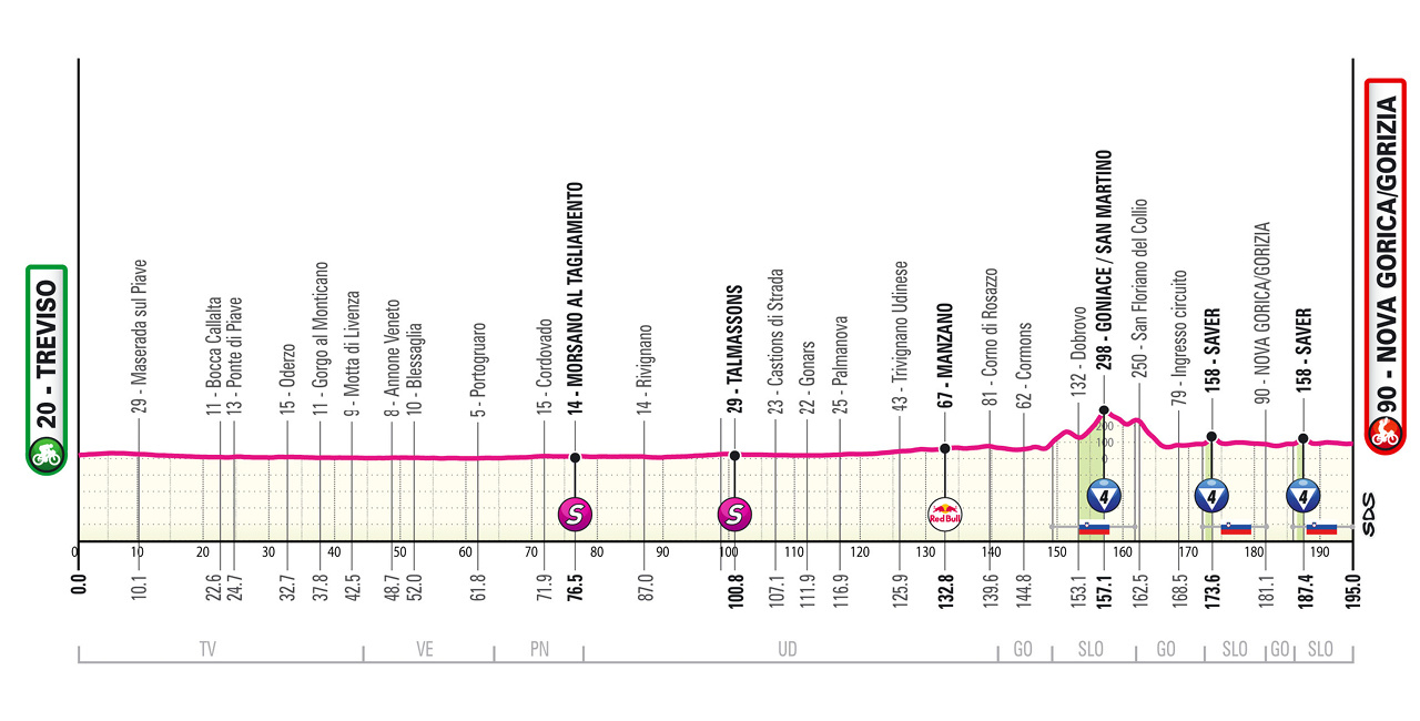 从cyclocross城市Treviso,它再次经过台球平坦的道路,到达意大利和斯洛文尼亚共享的城市Nova Goriza/Gorica。结局确实有一些短暂的攀登,但是期望的是,我们-在这个Giro中无数次-可以再次取悦短跑运动员。