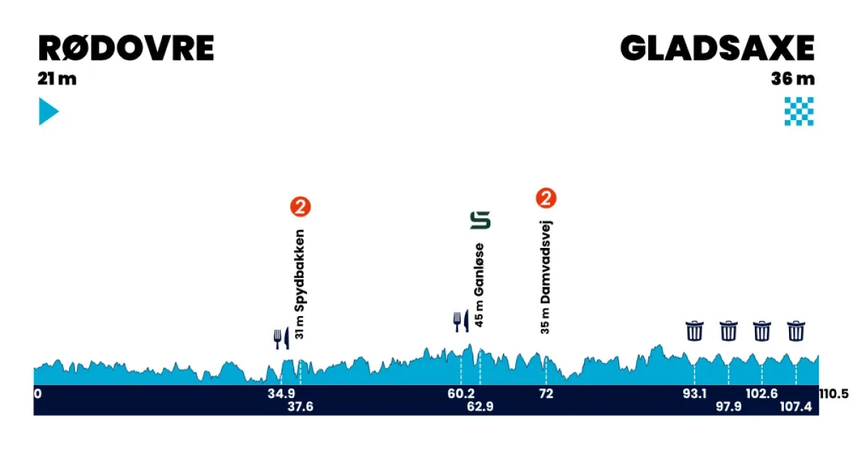 离开博恩霍尔姆,现在已经准备好接管哥本哈根西部和北部高原的道路。一个快速平坦的阶段,从Rødovre开始,通过比尔斯蒂克,斯兰格鲁普,甘利斯和斯莫鲁姆等,导致最后一圈和终点线在巴格斯韦德。一个具有挑战性但也相对较短的阶段,爆发可能有很好的机会保持距离。