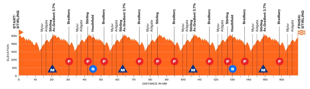 车手将穿越阿德莱德山丘,全长 169.8 公里,起点和终点均在斯特灵。接下来是八圈起伏的赛道,每次都快速攀爬两个爬坡。总海拔上升为 3,436 米。